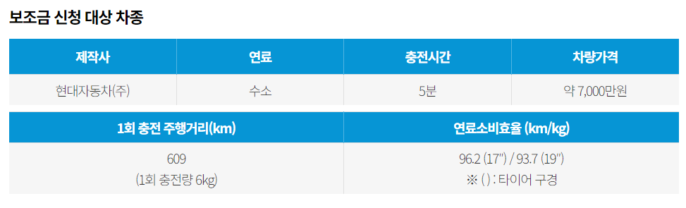 보조금 신청 대상 차종(출처: 서울시) - 넥쏘는 현대자동차에서 2018년부터 생산을 시작하였습니다. 투싼 3세대의 플랫폼으로 만들어 졌으며 기존 투싼과는 다르게 수소연료전지 전용 모델로 개발되었습니다. 현대자동차의 생산 모델 중 트럭과 함께 렌트카로는 제공되지 않습니다.