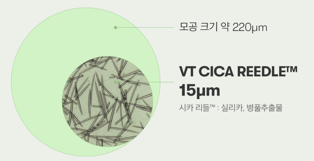 - 리들샷에는 모공보다 작은 바늘들이 들어 있습니다. 바늘이라고 하니까 좀 무서운데요. VT리들샷에 들어있는 시카리들은 매우 매우 작은 바늘로 실리카, 병풀 추출물로 구성되어 있습니다.